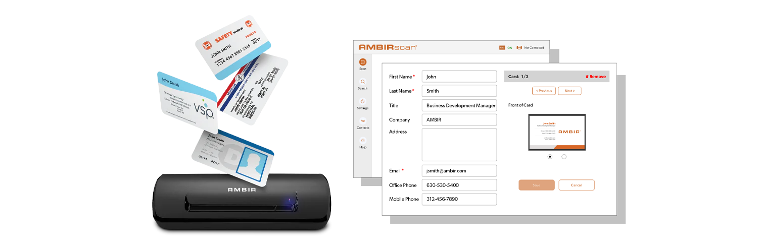 AMBIR business card scanners combine our leading portable and desktop scanners with our BCS (Business Card Scanning) software.