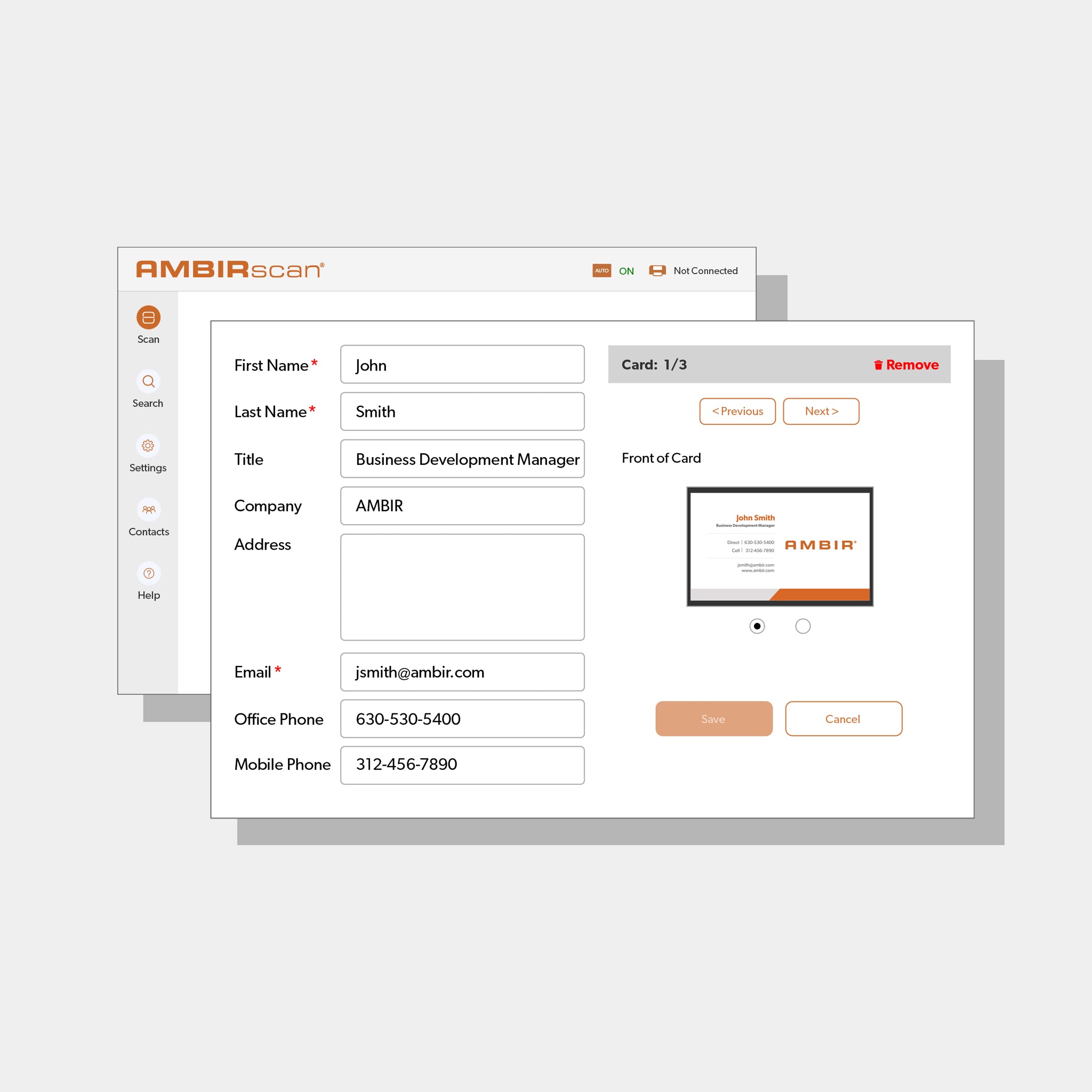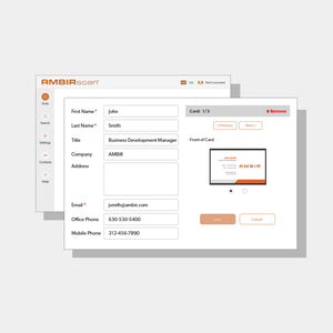AmbirScan business card software enables you to quickly and easily scan your business cards and import/create contacts in leading productivity and CRM applications. The BCS Software will easily read the image of the business card and convert to contact fields so you no longer have to manually type in contact information. The solution is great for creating email marketing lists, customer loyalty lists, sales prospect lists and customer lists.