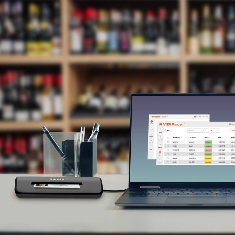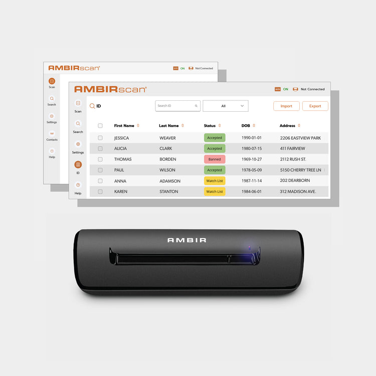 Using the Simplex ID Card Scanner with AmbirScan® ID Software, ensures accurate customer identification by removing manual verification steps. For bars this product package will streamline ID checking at the door, track VIP customers, and instantly identify previously banned individuals. For retail store owners, this product package will build the user’s customer base with every scan, while also allowing the user to export their customer list for marketing campaigns. Users can also set age restrictions to flag minors and stop them from purchasing age-restricted items.